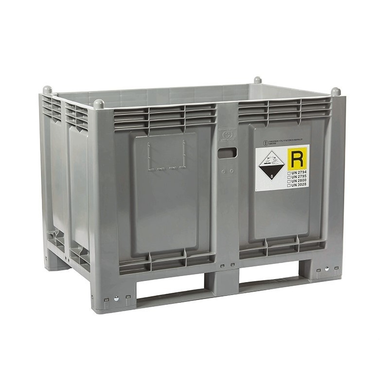 - Kontener jest wyposażony w sznurek i etykietę identyfikacyjną pokazującą 4 rodzaje akumulatorów, które można przechowywać: UN 2794, UN 2795, UN 2800 i UN 3028.