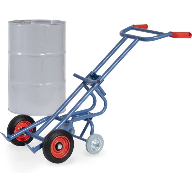 - Wózek do beczek wykonany ze spawanych rur stalowych, malowany proszkowo na kolor niebieski RAL 5007, powierzchnia zabezpieczona trwale.