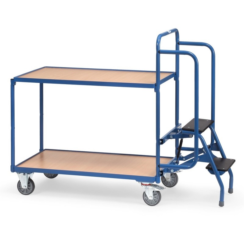 - Na przednich ścianach znajdują się drewniane stopnie, które podnoszą się automatycznie, gdy wózek nie jest obciążony, a po załadowaniu stoją bezpiecznie na podłożu, automatycznie blokując wózek.